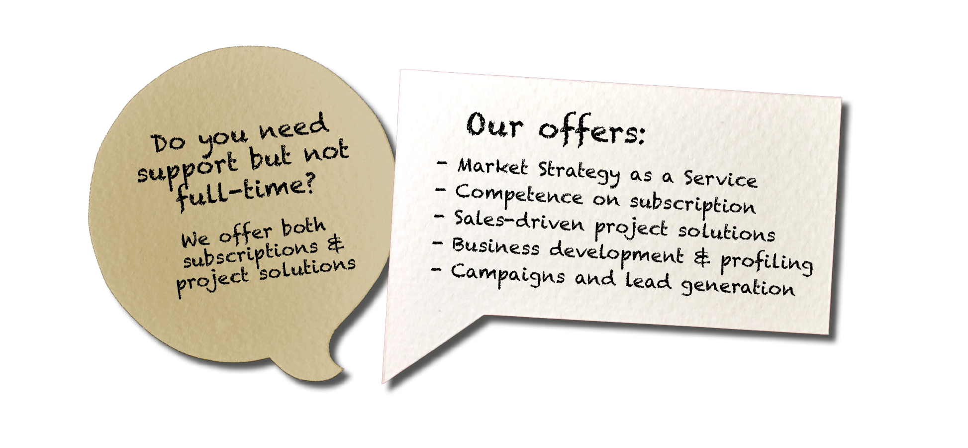 Whether you as an entrepreneur need a marketing plan or investment case for your idea or if you as a business leader need help entering a new market or with a new product, we have the solution.