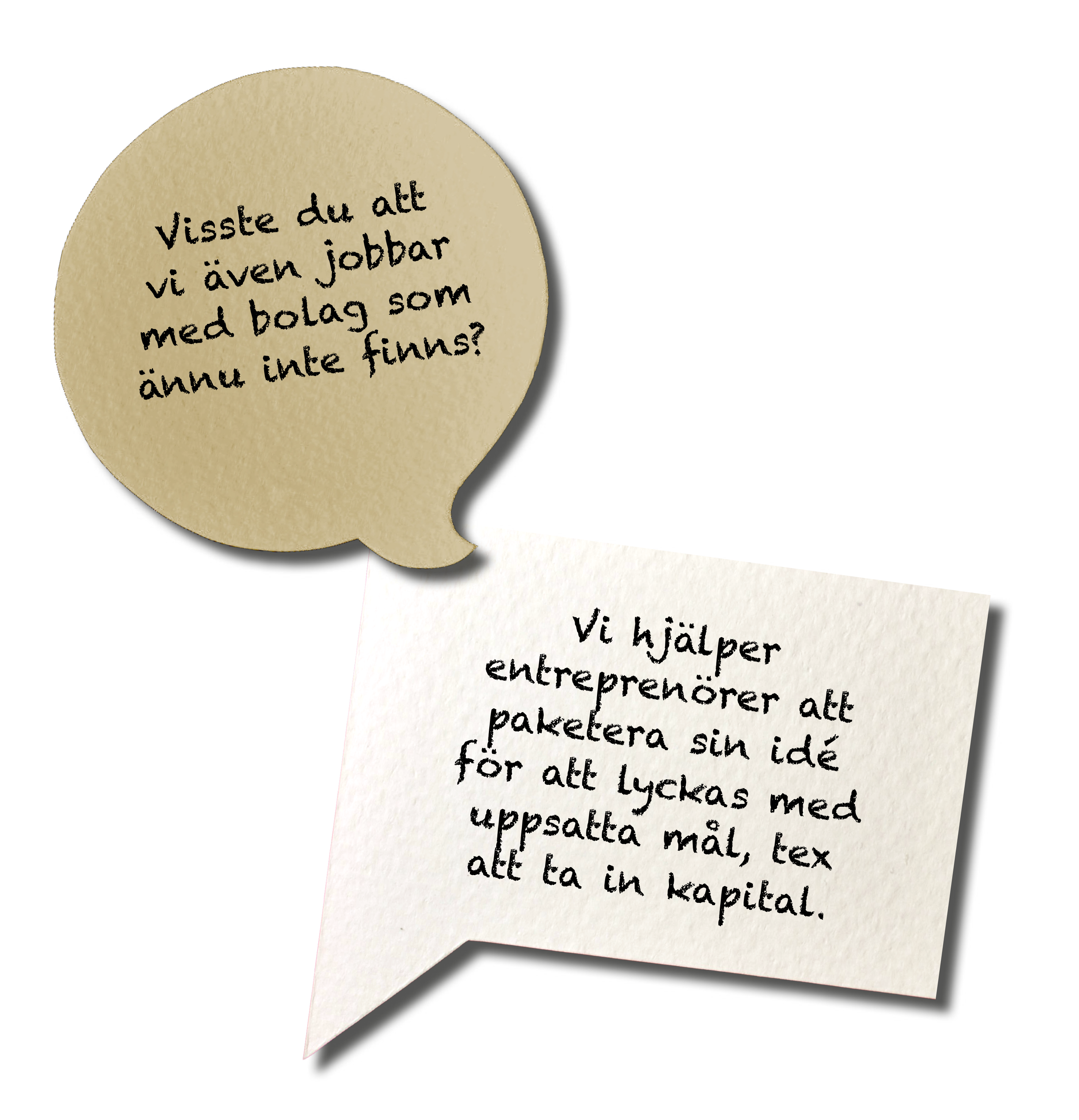 Oavsett om du är entreprenör med en ny idé eller företagsledare som vill expandera till nya marknader, lansera en ny produkt eller slå samman varumärken, vi hjälper dig hela vägen. Vi bygger även investeringscase för affärsidéer som behöver kapital.